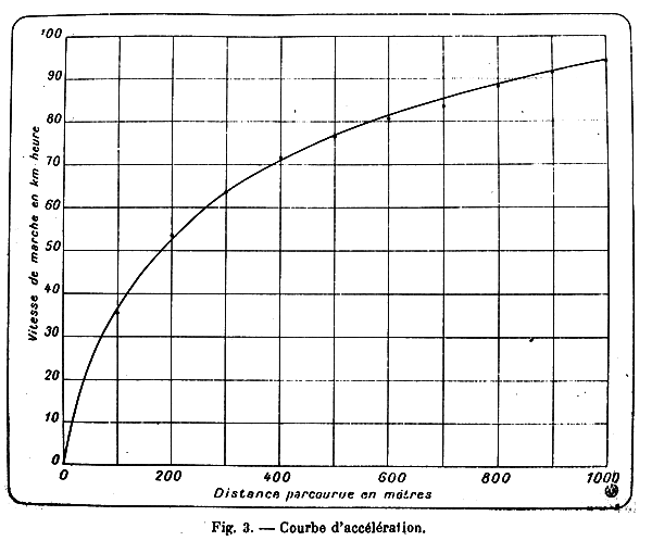 Vitesse maximum, accélération, freinage, ralenti. — La vitesse maximum obtenue par la voiture sur un kilomètre correspond au temps de 36 secondes 8/10 et 37 secondes 4/10 ; soit 97 kilomètres à l’heure.