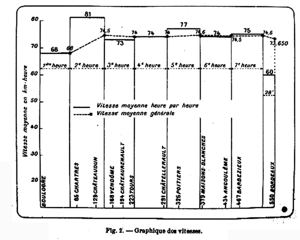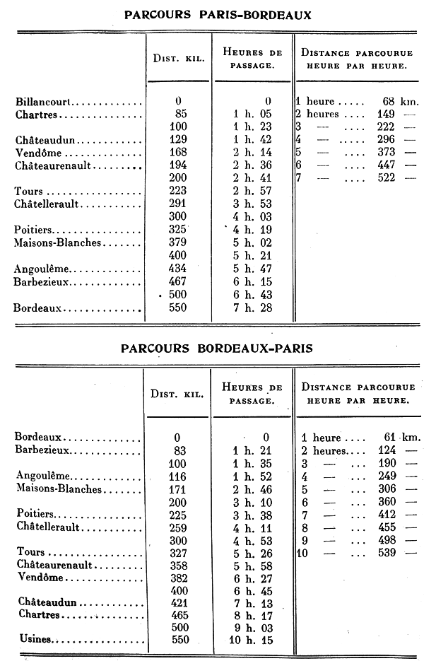 La durée totale de marche de Bordeaux à Billancourt a été de dix heures quinze minutes, ce qui correspond à une vitesse moyenne de 53km,658 à l’heure.