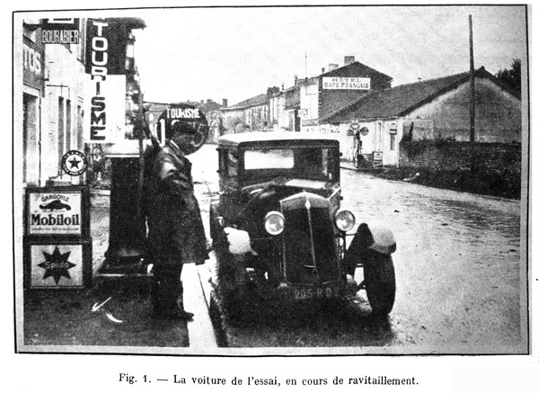 La mission dont nous avait chargé la Société des Automobiles Renault consistait à effectuer avec cette voiture le trajet Billancourt-Bordeaux par la route nationale n° 10 dans un sens, à une vitesse aussi élevée que possible, et dans l’autre sens, à une vitesse correspondant à l’utilisation de la voiture dans les conditions de tourisme ; à relever des vitesses moyennes de marche, la consommation d’essence, d’huile et. d’eau a déterminer la vitesse maximum dont la voiture était capable ; à établir les courbes de démarrage et de freinage